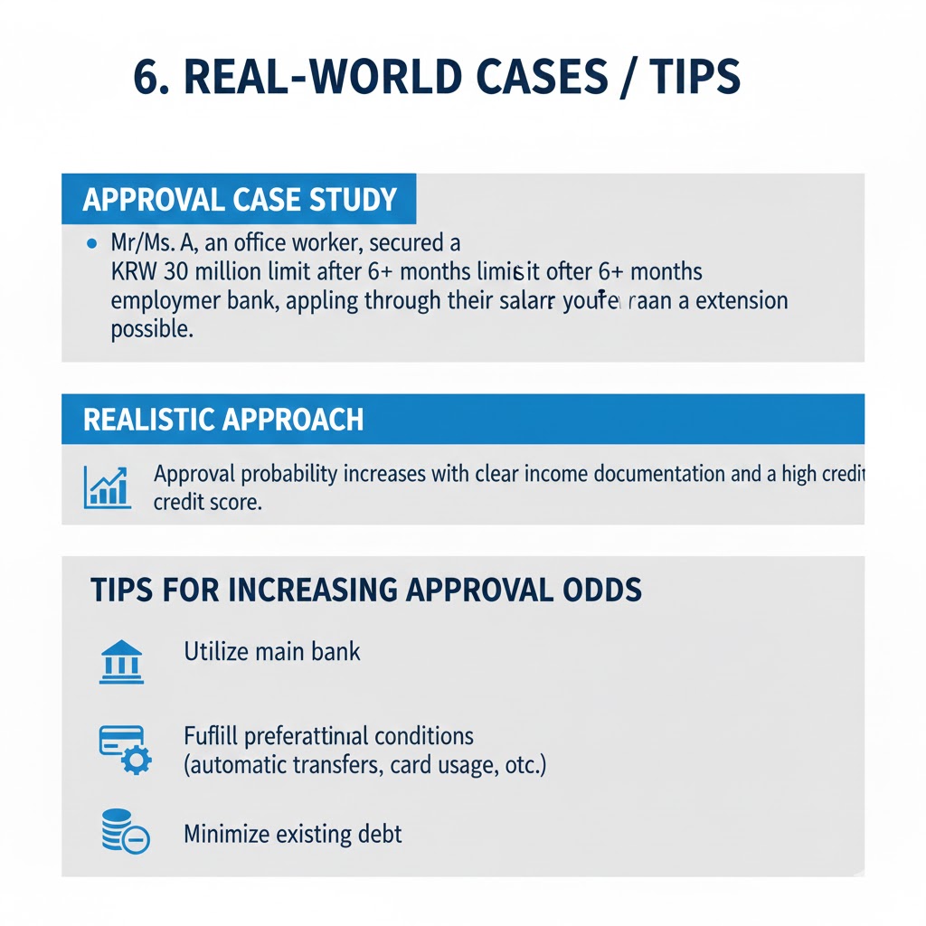 - 승인 사례: 직장인 A씨는 6개월 이상 재직, 급여이체 은행을 통해 신청하여 3천만 원 한도 승인.
